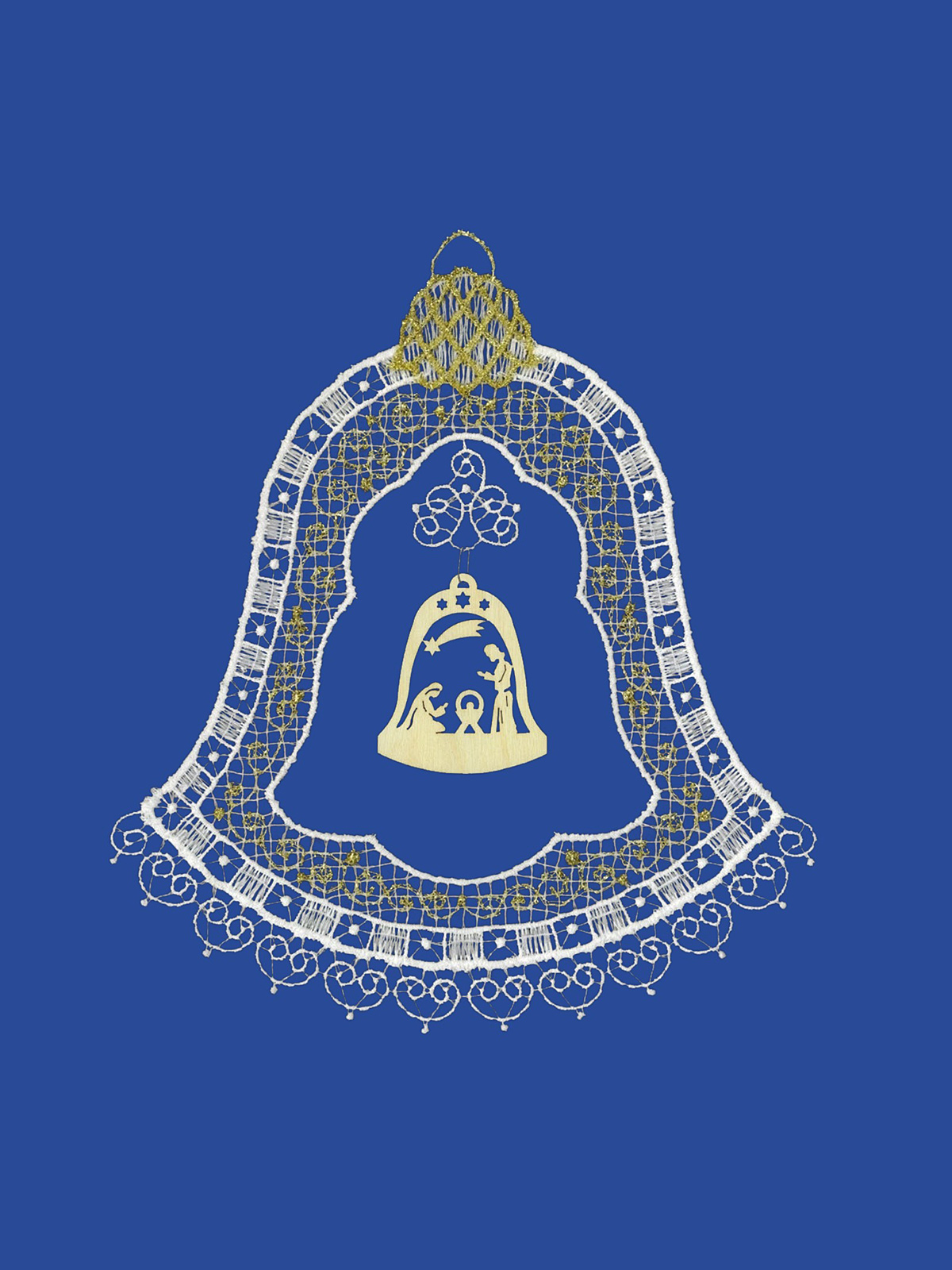 Plauener Spitze Fensterbild Anhänger Glocke with Laminat Krippe