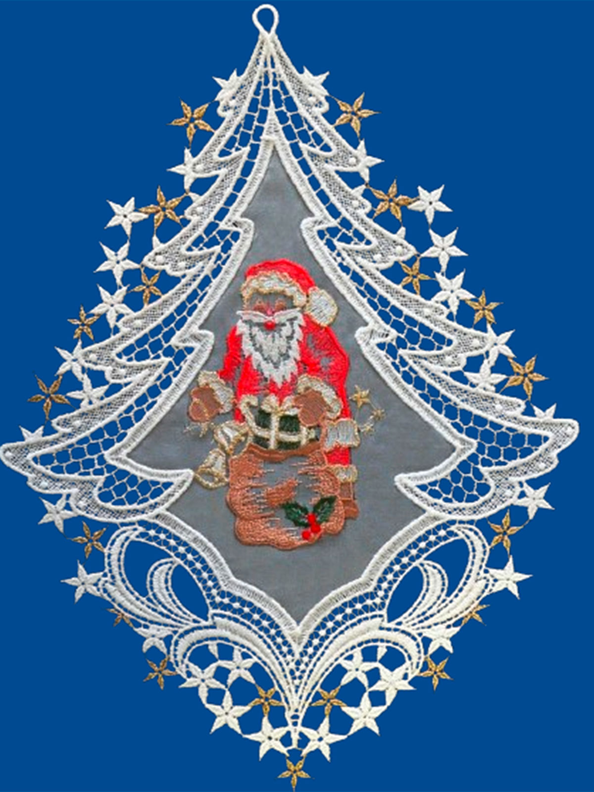 Edles Plauener Spitze Fensterbild Baumrahmen Weihnachtsmann aus Original Plauener Spitze® – 100% Polyester, Made in Germany. Perfekt als Geschenk und Weihnachtsdeko.