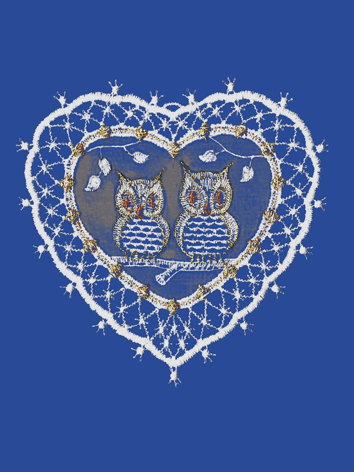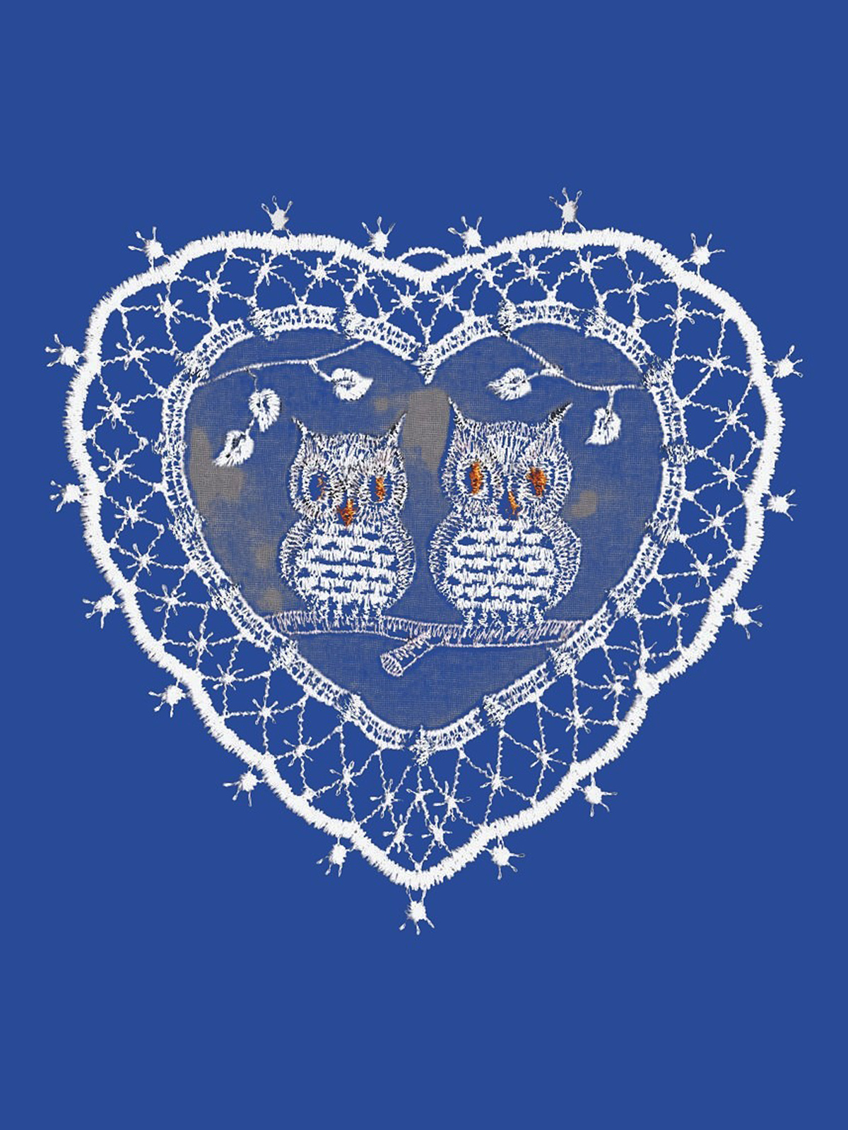 Plauener Spitze Fensterbild Herzrahmen Schnee-Eulen