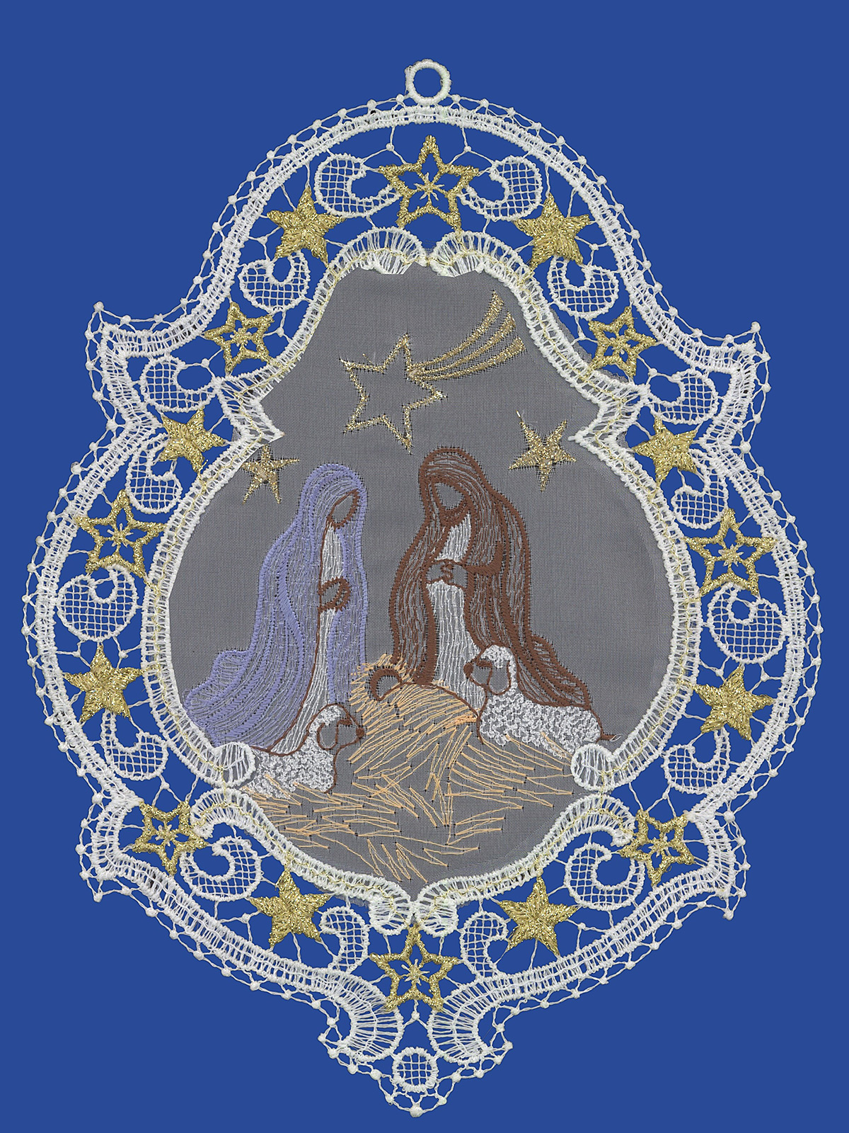 Edles Plauener Spitze Fensterbild Krippe aus Original Plauener Spitze® – 100% Polyester, Made in Germany. Perfekt als Geschenk und Weihnachtsdeko.