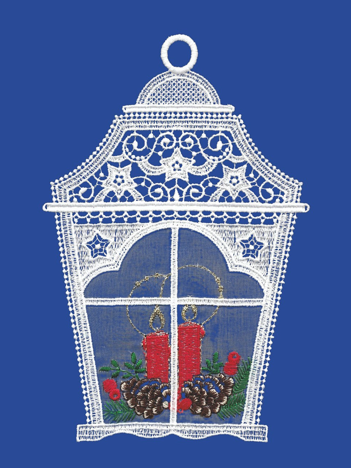 Edles Plauener Spitze Laternenrahmen Kerzen aus Original Plauener Spitze® – 100% Polyester, Made in Germany. Perfekt als Geschenk und Weihnachtsdeko.