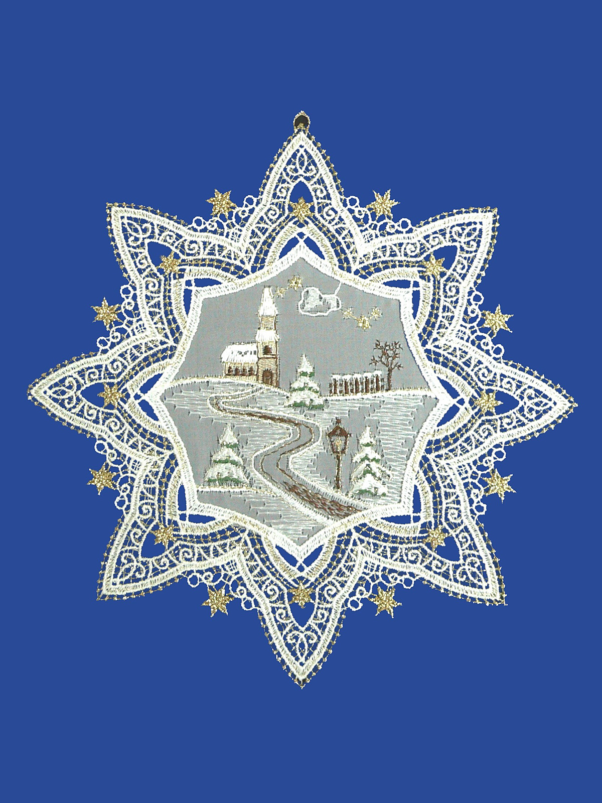 Edles Plauener Spitze Fensterbild Sternrahmen Winterspaziergang aus Original Plauener Spitze® – 100% Polyester, Made in Germany. Perfekt als Geschenk und Weihnachtsdeko.