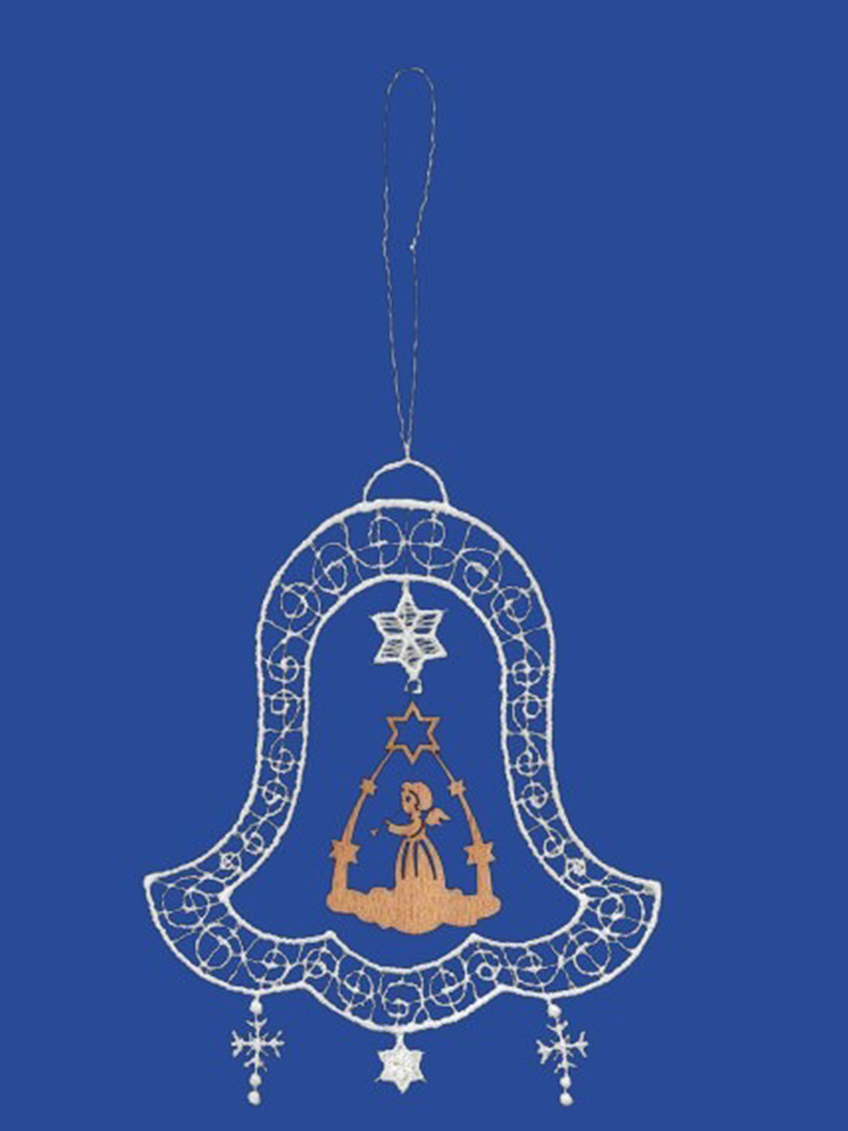 Edles 3er-Set Weihnachtsanhänger Glocke mit Holzlaminat Engel aus Original Plauener Spitze® – 100% Polyester, Made in Germany. Perfekt als Geschenk und Weihnachtsdeko.