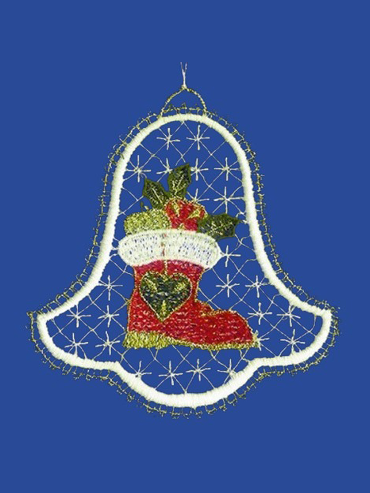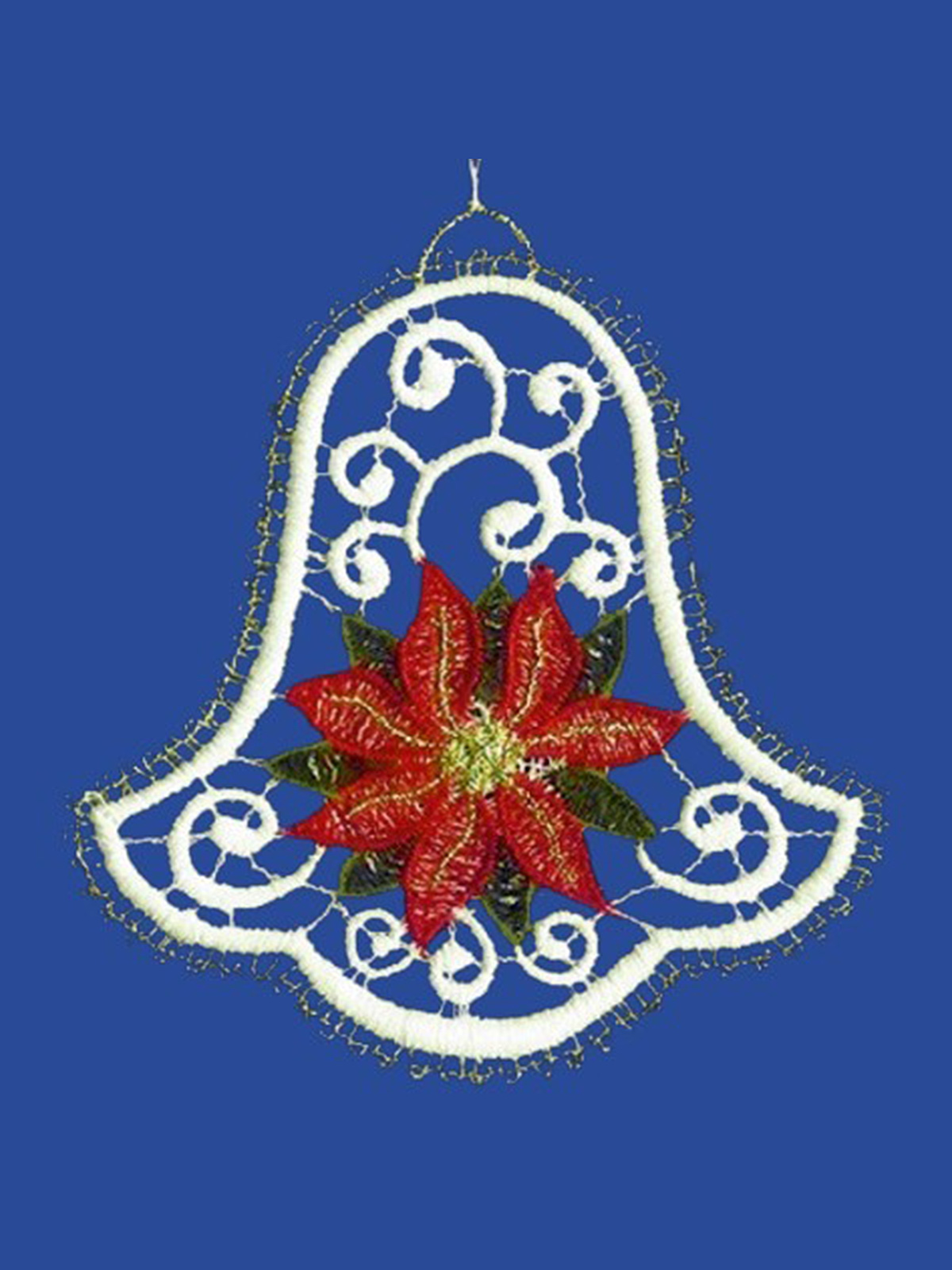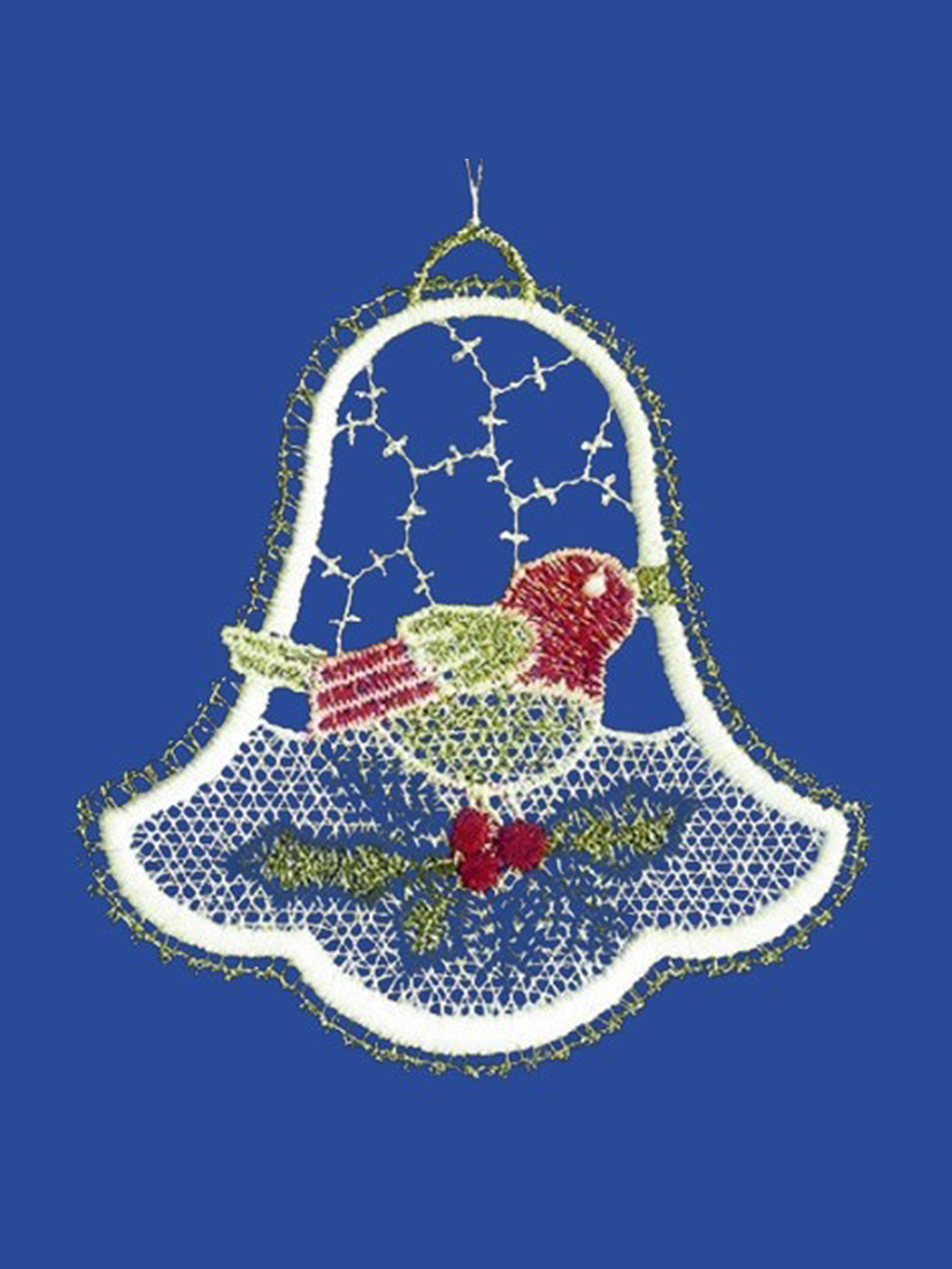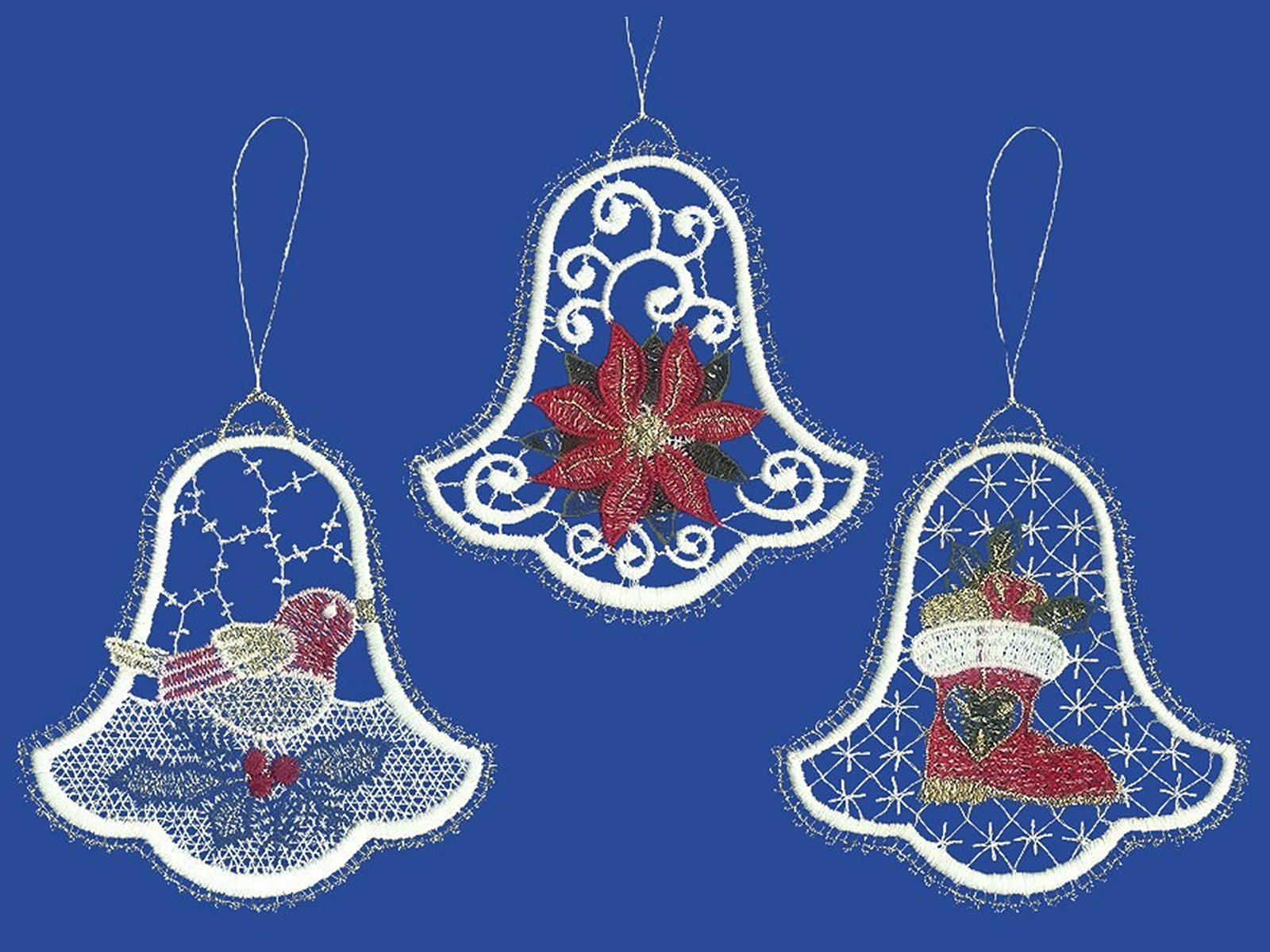 Edles 3er-Set Weihnachtsanhänger Glocken farbig aus Original Plauener Spitze® – 100% Polyester, Made in Germany. Perfekt als Geschenk und Weihnachtsdeko.