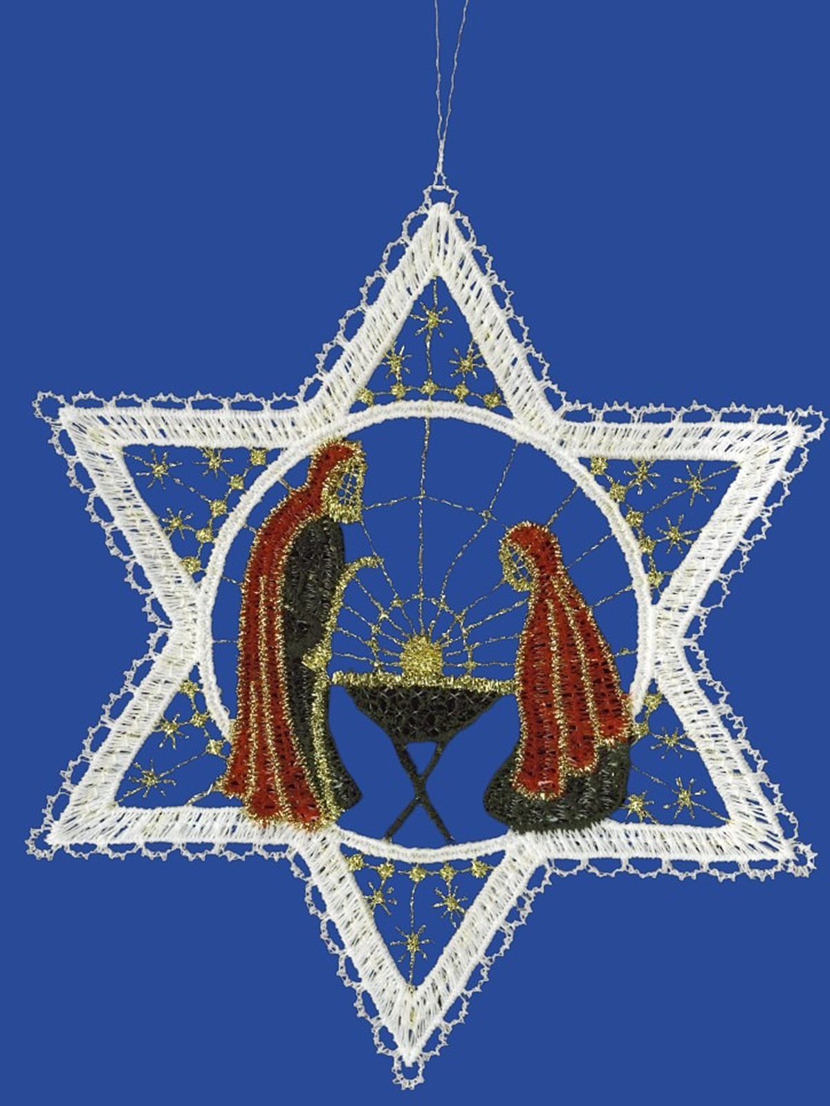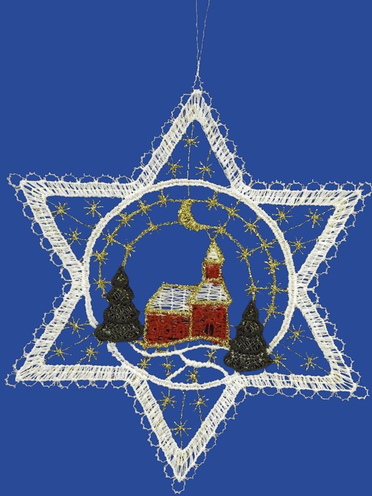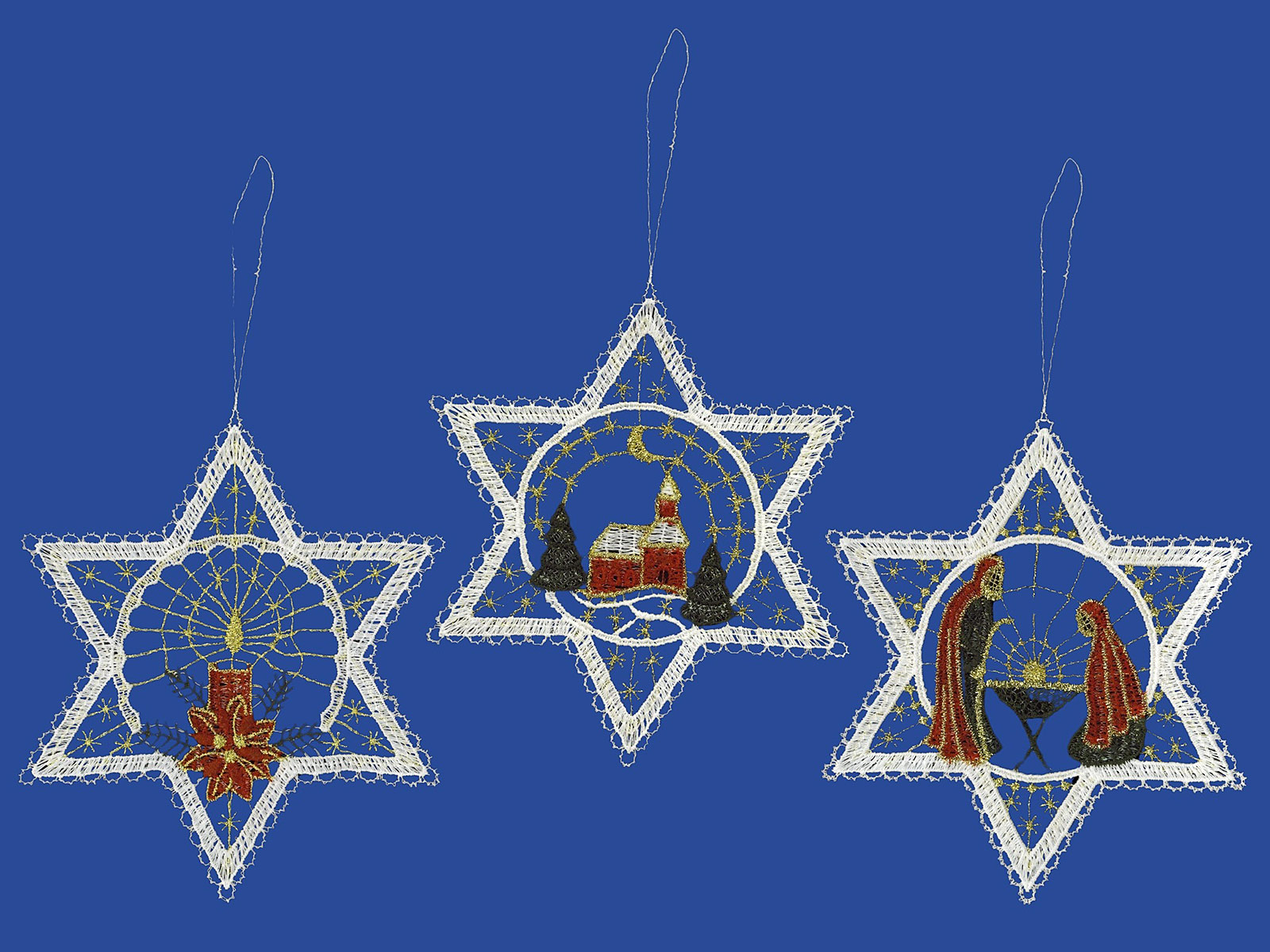 Edles 3er-Set Weihnachtsanhänger Sterne farbig aus Original Plauener Spitze® – 100% Polyester, Made in Germany. Perfekt als Geschenk und Weihnachtsdeko.