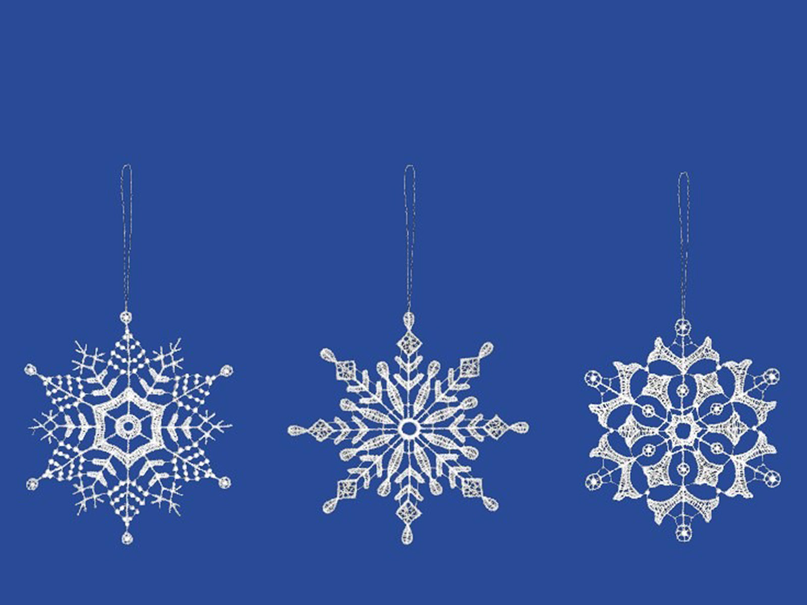 Edles Plauener Spitze 3er-Set Anhänger Schneesterne aus Original Plauener Spitze® – 100% Polyester, Made in Germany. Perfekt als Geschenk und Weihnachtsdeko.