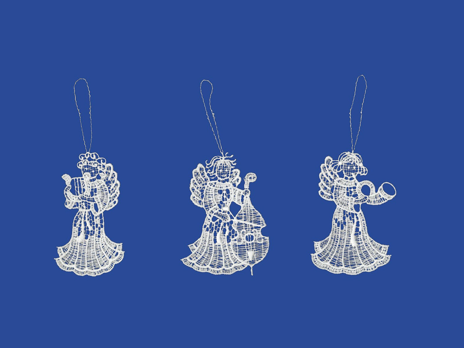 Edles Plauener Spitze 3er-Set Weihnachtsanhänger Engel mit Musikinstrument aus Original Plauener Spitze® – 100% Polyester, Made in Germany. Perfekt als Geschenk und Weihnachtsdeko.