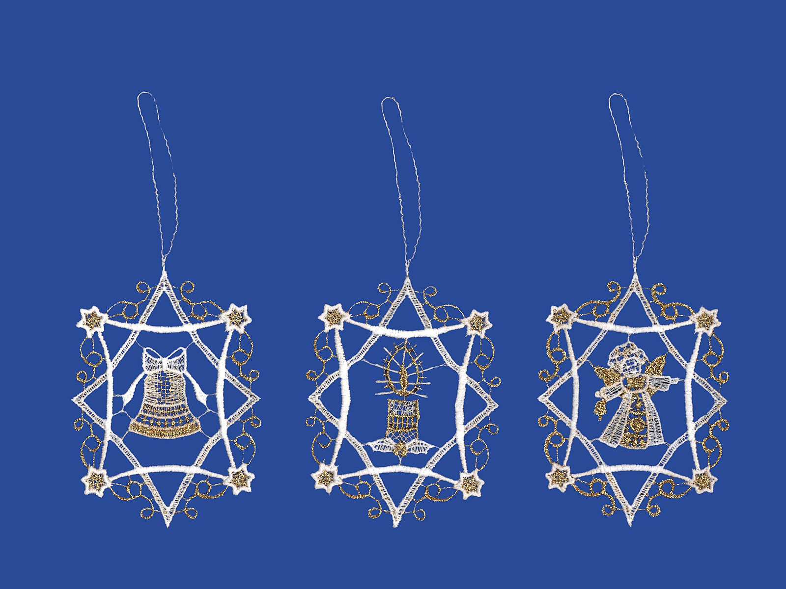 Plauener Spitze 3er-Set Weihnachtsanhänger Rauten mit Motiv ecru/gold