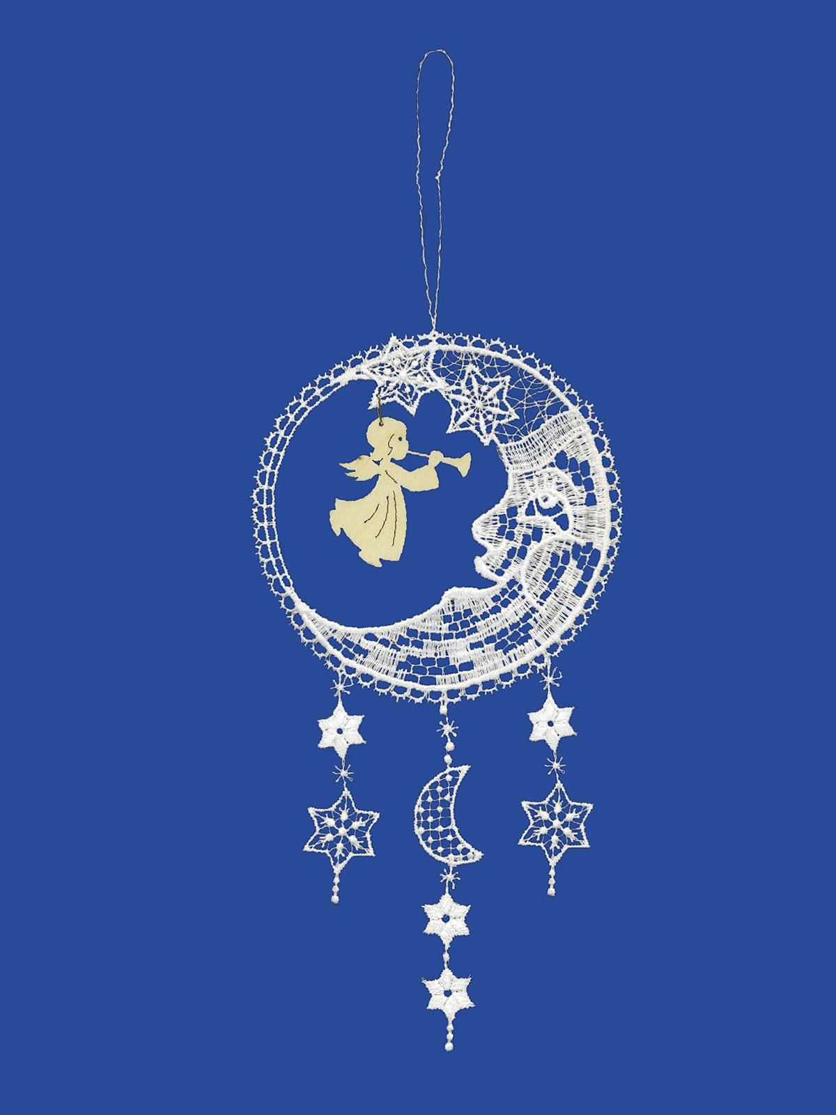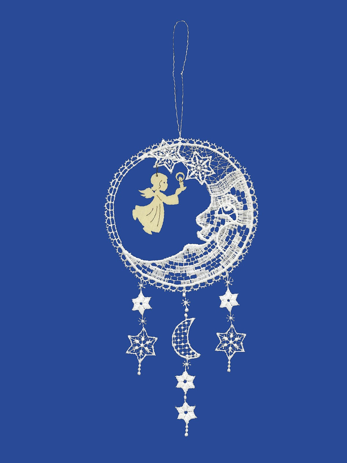 Plauener Spitze Fensterbild 3er-Set Weihnachtsanhänger Mond mit Holzlaminat